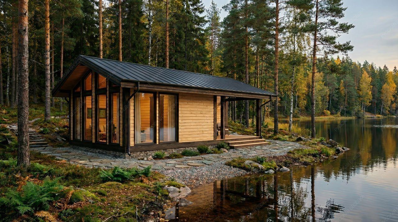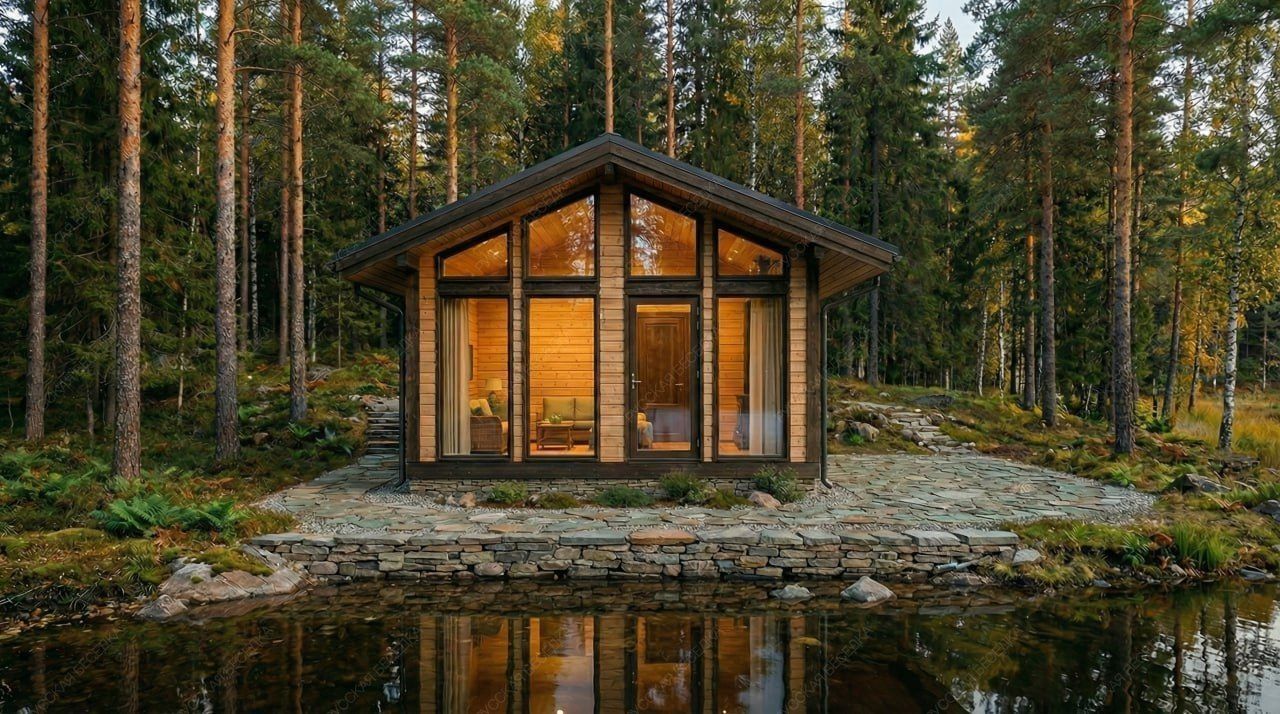 Решение ориентировано на создание комфортного пространства для семейного отдыха, где каждая зона имеет четкое назначение, а панорамное остекление объединяет интерьер с природным окружением.