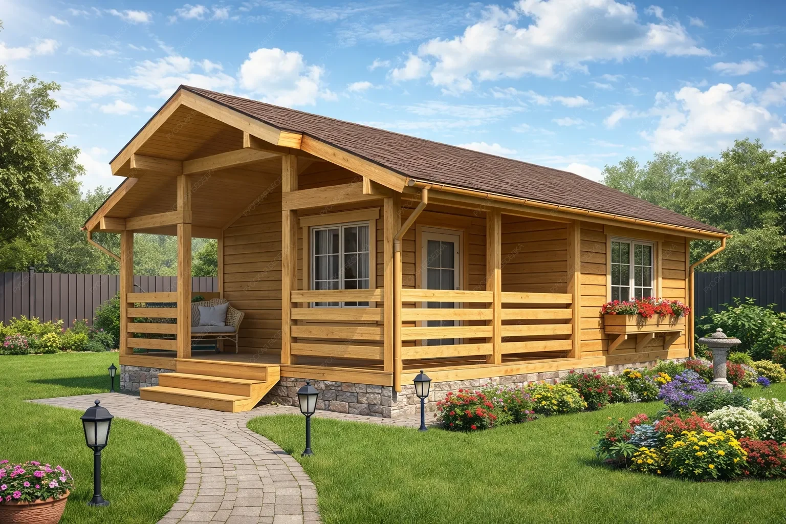 Квадратная баня «Ладань» размером 6х6 метров представляет собой классическую и компактную планировку общей площадью 36 кв.м. под двухскатной крышей. Каркасная технология обеспечивает оптимальное соотношение стоимости, скорости возведения и теплоэффективности. Внутреннее пространство организовано с особым вниманием к функциональности и комфорту процедур. Отличительной чертой модели является четкое и удобное зонирование: отдельная парная 5.57 кв.м., просторная душевая 5.50 кв.м. и изолированный санузел 0.90 кв.м. Центральным местом отдыха выступает комната площадью 17.78 кв.м., что для строения таких габаритов является значительным преимуществом. Наличие крыльца (террасы) формирует буферную зону и придает проекту законченный вид. Данная конфигурация идеально подходит для стандартного участка и рассчитана на одновременное посещение небольшой семьей или компанией друзей, предлагая все необходимое для полноценного банного ритуала без излишеств.