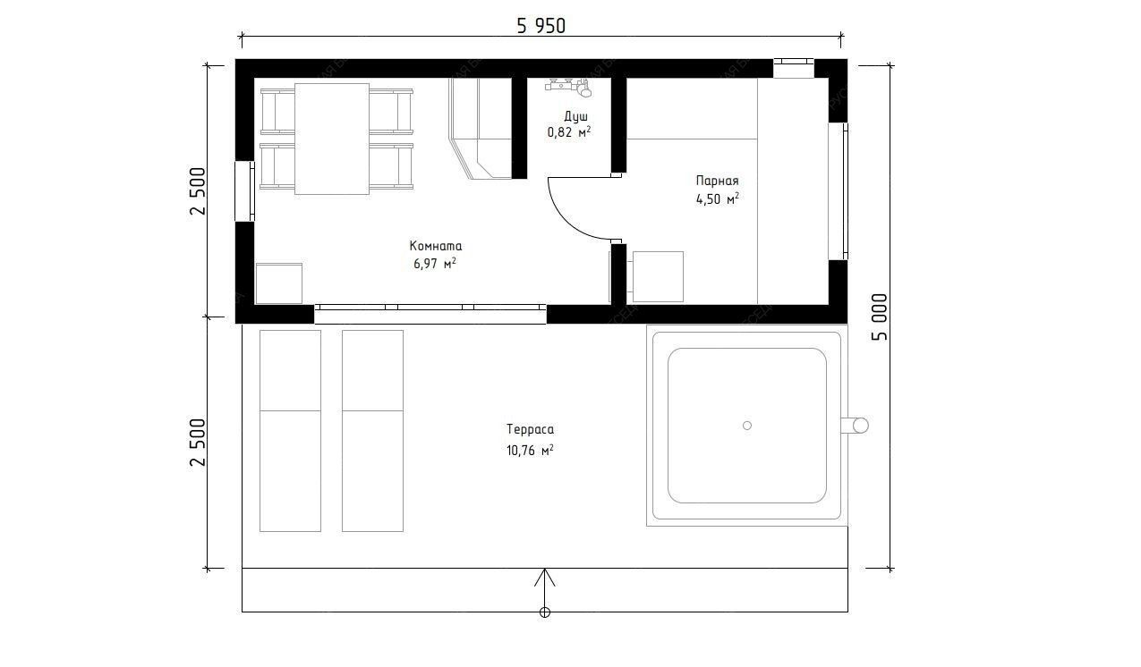 Баня «Равелла» — образец эргономичной и сбалансированной планировки, где даже на ограниченной площади достигнута полная функциональность. Её отличительная черта — симметричная компоновка: площадь открытой террасы (10,76 м²) практически равна площади внутренних помещений, что создает гармоничное равновесие между закрытым пространством и отдыхом на природе.  Внутренняя организация продумана с максимальной рациональностью. Комфортная парная (4,5 м²) с традиционным окном-форточкой обеспечивает качественный легкий пар. Отдельный душевой отсек повышает уровень гигиены и удобства, а уютная комната отдыха (6,97 м²) предназначена для расслабления после процедур. Односкатная крыша и компактные общие габариты (2,5х5,95 м) придают строению современный, аккуратный вид, идеально подходящий для участков с ограниченным пространством.  Качественная древесина и точный конструктив гарантируют эффективное теплосбережение и долговечность. Проект «Равелла» предлагает законченное решение для ценителей классической бани, где в минимальных габаритах собрано всё необходимое для полноценного отдыха и оздоровления, делая эту модель практичным и осознанным выбором.