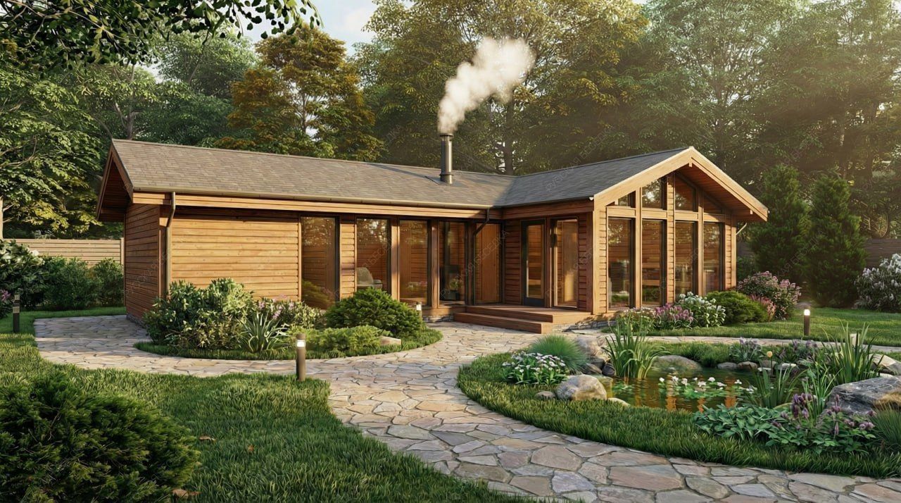 Двухскатная крыша придает строению солидный, завершенный облик и обеспечивает надежную защиту от осадков. Каркасная технология гарантирует высокую скорость возведения, энергоэффективность и долговечность конструкции. Данный проект ориентирован на создание многофункционального комплекса, где традиционные банные процедуры гармонично сочетаются с возможностями для полноценного загородного отдыха и гостеприимства.