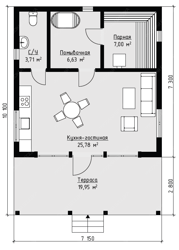 Каркасная баня «Олана» с двухскатной крышей представляет собой масштабный проект площадью 72 кв.м. при габаритах 10,1х7,15 метра. Планировка ориентирована на комфортный отдых большой компанией и включает все функциональные зоны: просторную парную 7,00 кв.м., отдельные санузел и помывочную, а также кухню-гостиную 25,78 кв.м. Ее ключевой особенностью является панорамное остекление, интегрированное в зону гостиной. Это создает эффект единения интерьера с природным окружением, наполняя пространство светом. Значительная площадь отведена под открытую террасу 19,95 кв.м., являющуюся логическим продолжением гостиной для отдыха на свежем воздухе. Двухскатная крыша обеспечивает классический, солидный облик и надежность конструкции. Каркасная технология позволяет реализовать такой проект с оптимальными сроками возведения и высокими показателями энергоэффективности. Данная модель предназначена для создания полноценного гостевого или семейного комплекса, где традиционные банные процедуры гармонично сочетаются с возможностями для гостеприимства и продолжительной релаксации в едином, визуально открытом пространстве.