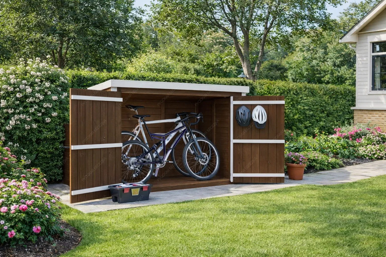 Деревянный гараж для велосипедов — это продуманное решение для хранения двухколёсной техники и сопутствующего инвентаря. Компактное строение из натурального дерева защищает велосипеды от дождя, снега, ультрафиолета и перепадов температур, продлевая срок службы узлов и сохраняя внешний вид рам. Внутреннее пространство организовано с учётом потребностей активных людей: предусмотрены удобные полки для шлемов, насосов, инструментов и смазочных материалов, а также крючки для подвешивания покрышек, велокомпьютеров или рюкзаков. Такая система хранения позволяет быстро найти нужную вещь и поддерживать порядок без лишних усилий. Изготовленный из качественной древесины, гараж гармонично вписывается в ландшафт загородного участка или городского двора, не нарушая эстетики окружающей среды. Дерево обеспечивает естественную вентиляцию, предотвращая образование конденсата, который вреден для металлических деталей. Конструкция рассчитана на длительную эксплуатацию и может быть выполнена в различных размерах, чтобы вместить от одного до нескольких велосипедов. Надёжные крепления и устойчивость к ветровым нагрузкам гарантируют сохранность имущества даже в сложных погодных условиях. Аккуратное размещение велосипедов освобождает полезную площадь гаража, сарая или балкона, делая повседневную жизнь более комфортной и организованной.
