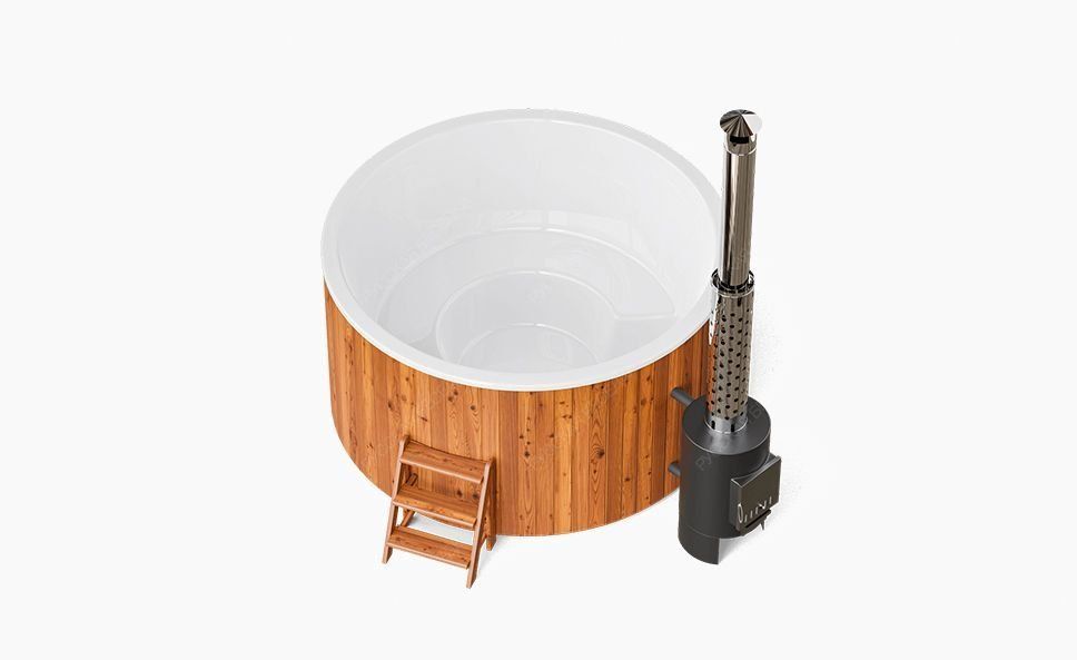 Благодаря объему 1800 л купель способна вместить аж 2 семьи — 8 человек! Это самая большая по объему воды купель в стране! Если вы хотите отнести печь подальше от купели и отделить персонал от гостей декоративной перегородкой, просто закажите удлиненные патрубки. Большая компания, много воды и позитива, смех и пузыри аэромассажа, бесконечные беседы и посиделки ночи напролет. Благодаря 72ч обжига древесины в печи при 95С, выгорает вся органика, поэтому дерево долго сохраняет форму и геометрию и не боится атмосферных осадков. Сиденье в купели Comfort 220 не закольцованное, поэтому на четверть круга есть большое пространство для плавания детей, что позволяет использовать купель в качестве микробассейна. Защитный кожух на дымоходе печи надежно защищает от ожогов со всех сторон, но при этом выглядит стильно и аккуратно.