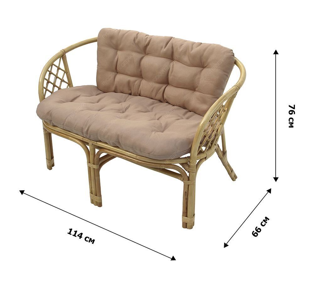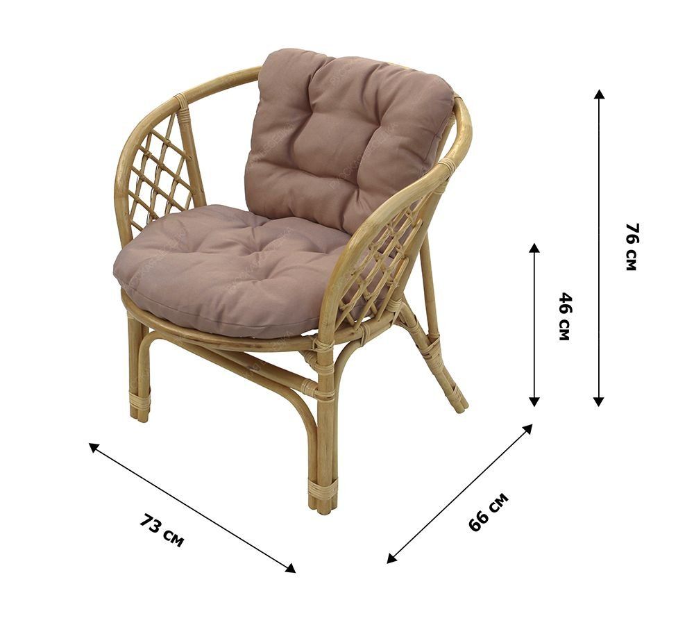 Дополнительно Класс ротанга А. Глубина сиденья 52см, высота от пола до сиденья 46 см. Подушки упакованы в полиэтиленовый пакет по 2 штуки (спинка+сиденье). Чехлы не съемные, материал влагоотталкивающий, сухая чистка