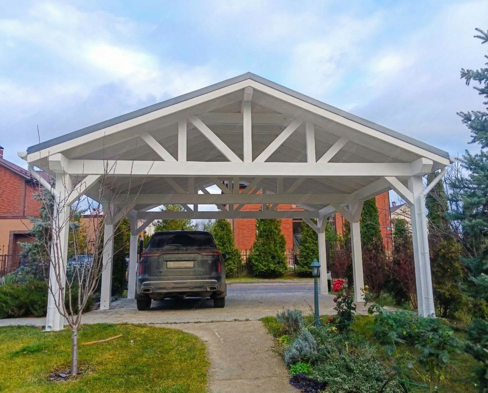 Навес из дерева послужит отличным парковочным местом для одного или нескольких автомобилей.
