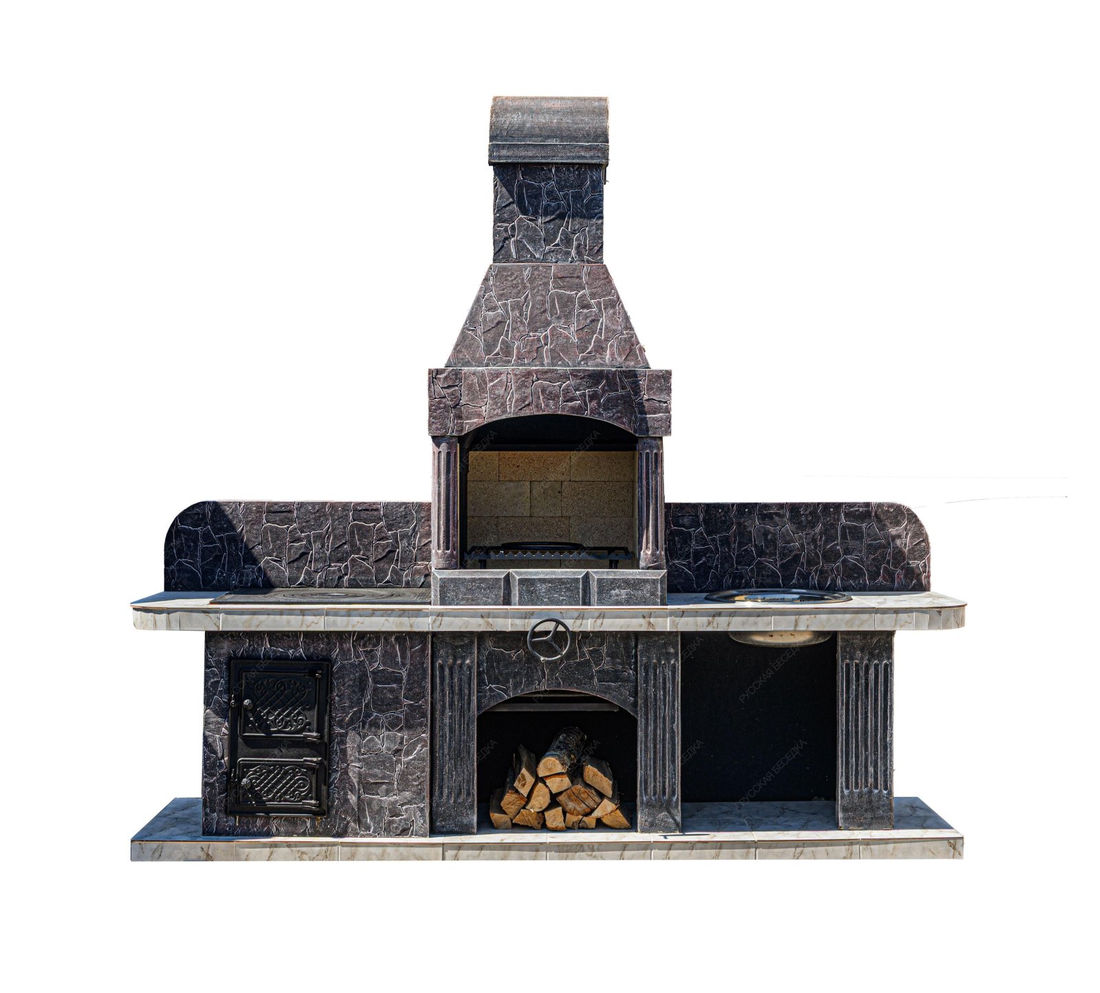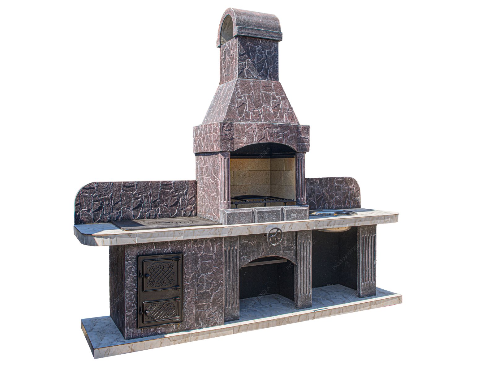 Мы предлагаем купить печь-барбекю для беседки, летней кухни или улицы в очень интересном оформлении. Отделка предполагает использование гранита, мрамора, байрамикса. Это не только красивое, но и функциональное решение, потому что натуральный камень хорошо моется, он устойчив к высокой температуре и холоду, механическому воздействию.