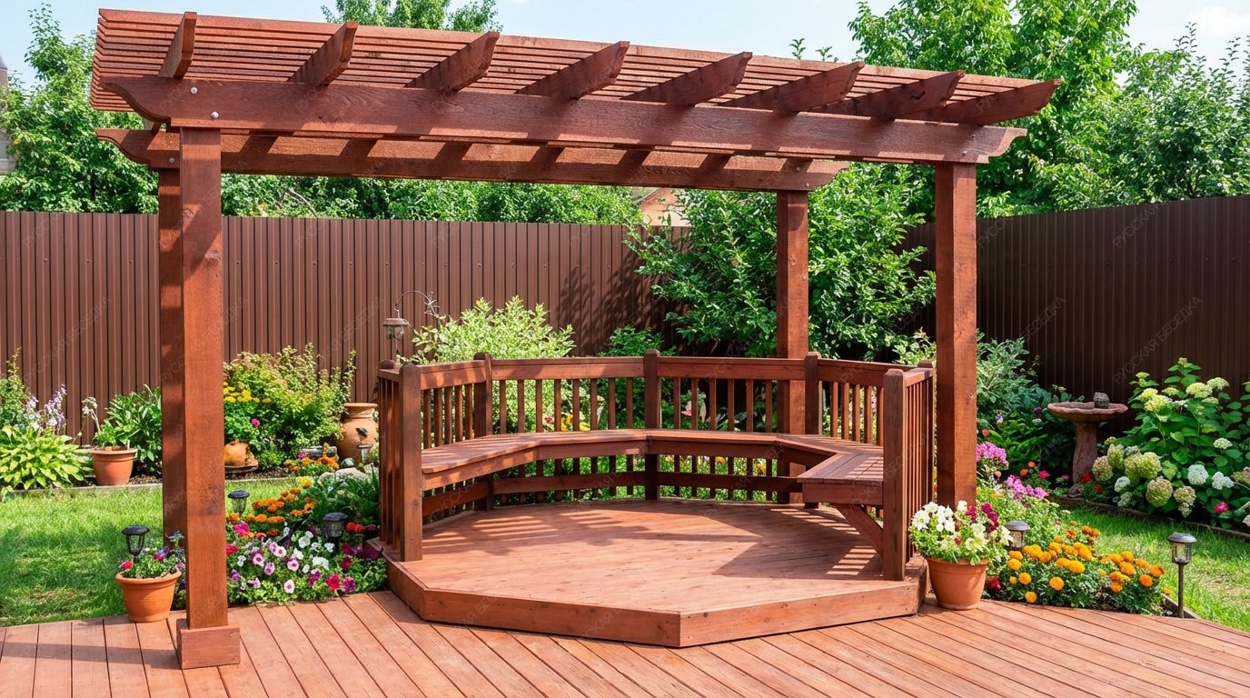 Пергола с навесом обеспечивает надежную защиту от солнечных лучей, создавая тенистое пространство для отдыха. Она станет идеальным местом для встреч с друзьями, чтения книг или приема пищи на свежем воздухе.
