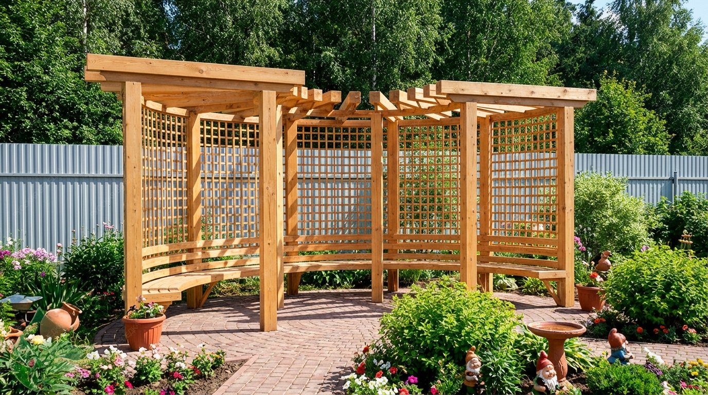 Пергола с навесом обеспечивает надежную защиту от солнечных лучей, создавая тенистое пространство для отдыха. Она станет идеальным местом для встреч с друзьями, чтения книг или приема пищи на свежем воздухе.