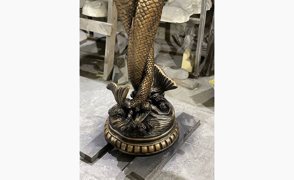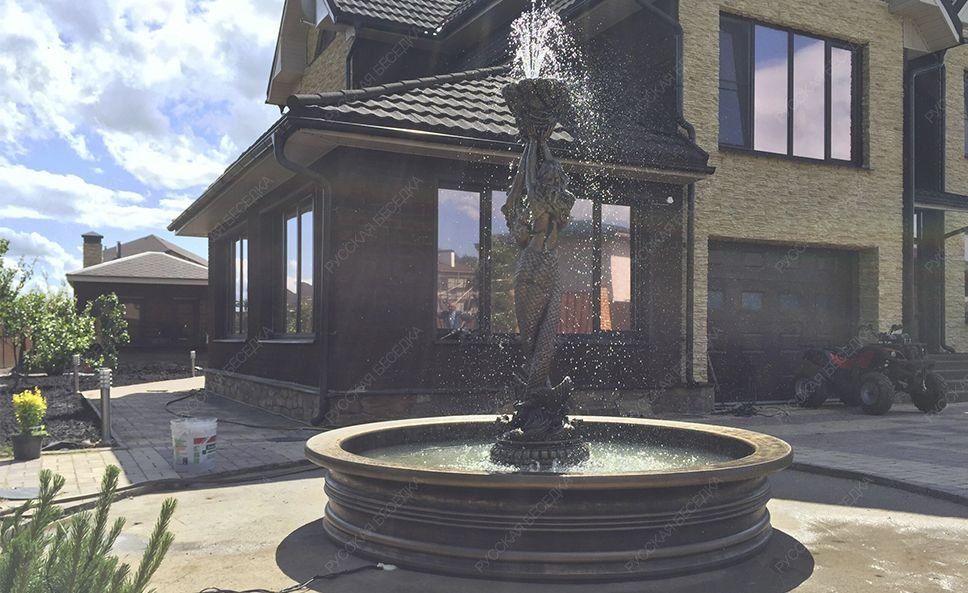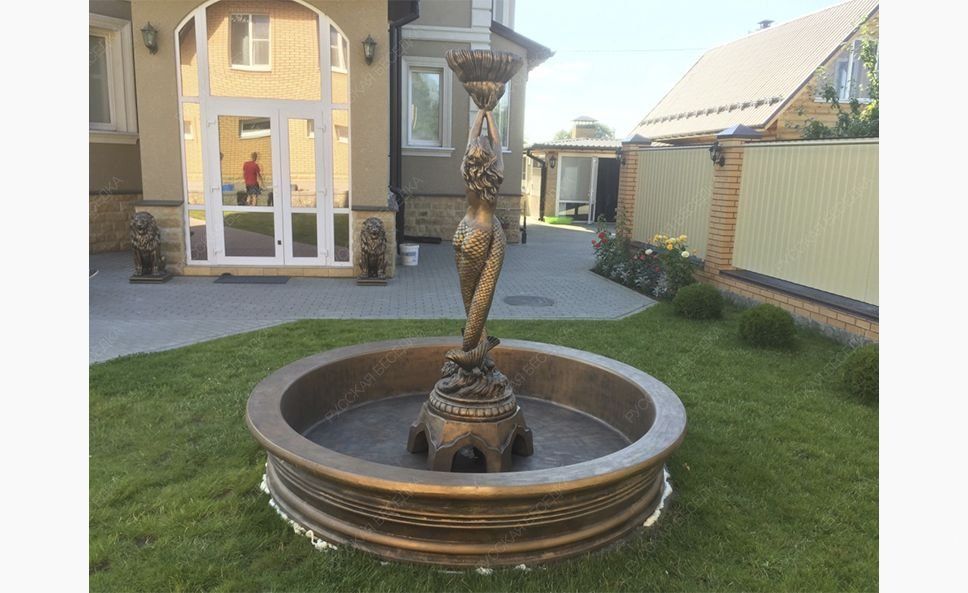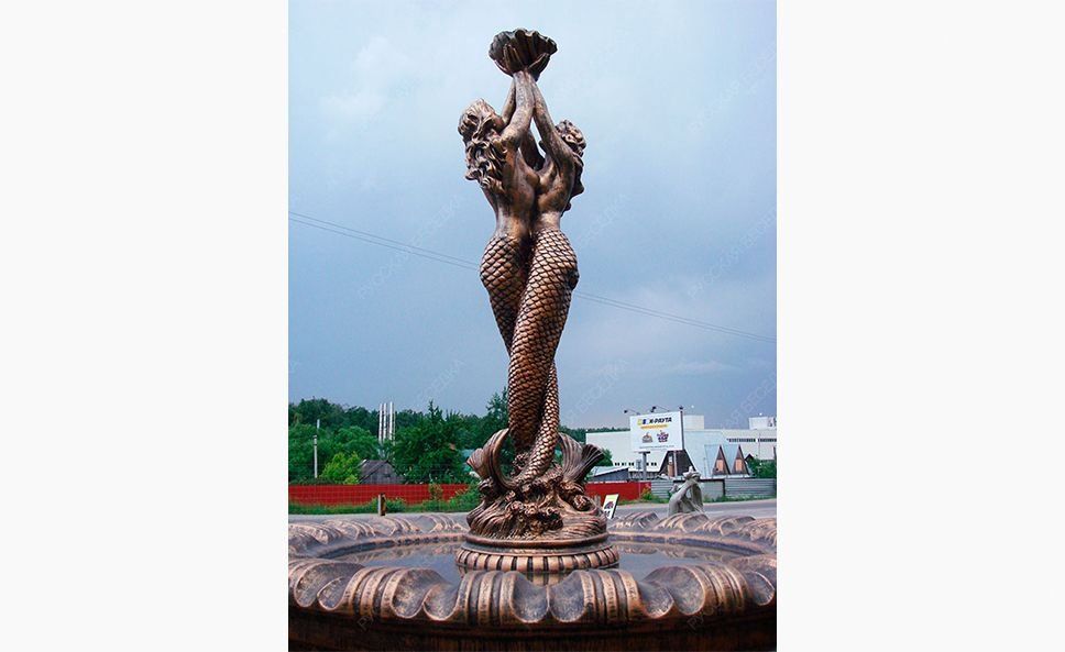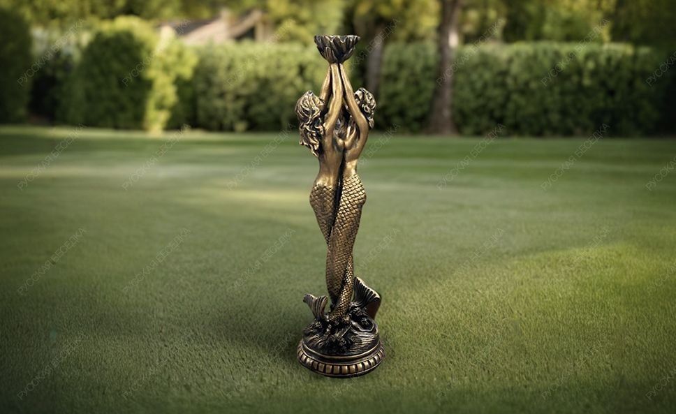 Универсальная садово-парковая композиция «Русалки» отличается чувственной пластичностью форм, филигранной детализацией фрагментов и обильной декорацией опорного основания. Русалки для сада могут использоваться как элемент ландшафтного декорирования, при необходимости украсить фасад здания, также выступить в качестве полноценного фонтана или в роли одного из его элементов. Парная статуя русалок с массивным декоративным основанием и функциональным навершием в виде чаши-ракушки, которую можно использовать в качестве вазона или фонтанчика. Наши скульптуры зарекомендовали себя как универсальный ландшафтный и архитектурный декор. Также их можно использовать как элементы больших уличных фонтанов. Бетонная скульптура в отделке под классическую бронзу хорошо приспособлена к условиям российского климата и сохраняет свой первоначальный внешний вид на протяжении многих сезонов. Создавая эту скульптуры, мы выбрали позу, которая во всех нюансах раскрывает красоту и грацию женского тела. Статуи отличаются безупречными пропорциями, реалистичной пластикой и тонкой проработкой деталей. Массивное основание имеет богатый декор и служит надежной опорой, которая обеспечивает устойчивость скульптуры на любой поверхности. Наших русалок успешно используют в качестве садовых статуй, архитектурных элементов частных домовладений и общественных заведений. В руках русалки удерживают чашу-ракушку. Она придает статуе визуальный баланс, уравновешивая массивное основание, и расширяет варианты ее использования. Благодаря чаше скульптуру можно задействовать как небольшой вазон, садовый фонтанчик или элемент большого фонтана в Москве. Для этих целей на этапе отливки мы закладываем в изделие силиконовый шланг. Установив на его конце насадку-распылитель и подключив к системе подачи воды, скульптуру преобразит эффектная струя в виде купола или гейзера. Скульптуры созданы из высокопрочного полимербетона с добавлением присадок, которые улучшают эксплуатационные характеристики материала. Отливка изделий произведена на вибростоле. Отработанная временем технология формовки позволяет добиться равномерной усадки смеси и достичь однородной структуры без полостей и других усадочных дефектов, присущих кустарному литью. Для придания дополнительной прочности скульптуры армируют. Декоративная отделка под классическую бронзу выполнена проверенными фасадными красками, не боящимися влаги, выгорания, растрескивания на морозе. Многоэтапная технология отделки предусматривает шлифовку, грунтование изделия, нанесение защитного покрытия для бетона. Краска наносится в несколько слоев с проработкой светотеневых эффектов, которые делают имитацию бронзы более реалистичной.