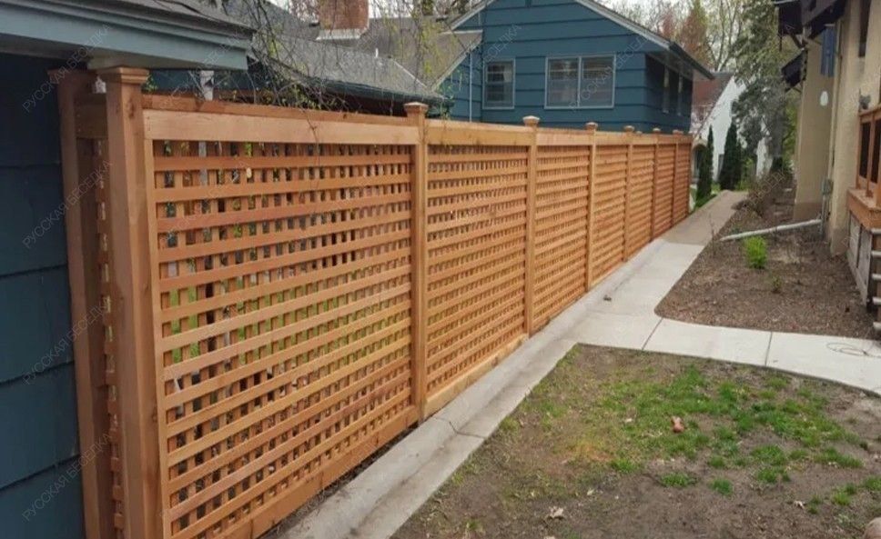 Профильная труба 40х20х2 мм, окрашенная в 2 слоя Обработка: Tikkurila METALLISTA PRIMER (грунт), краска Tikkurila Metallista в цвет заборной доски. Или деревянный каркас из строганного бруска 50х50